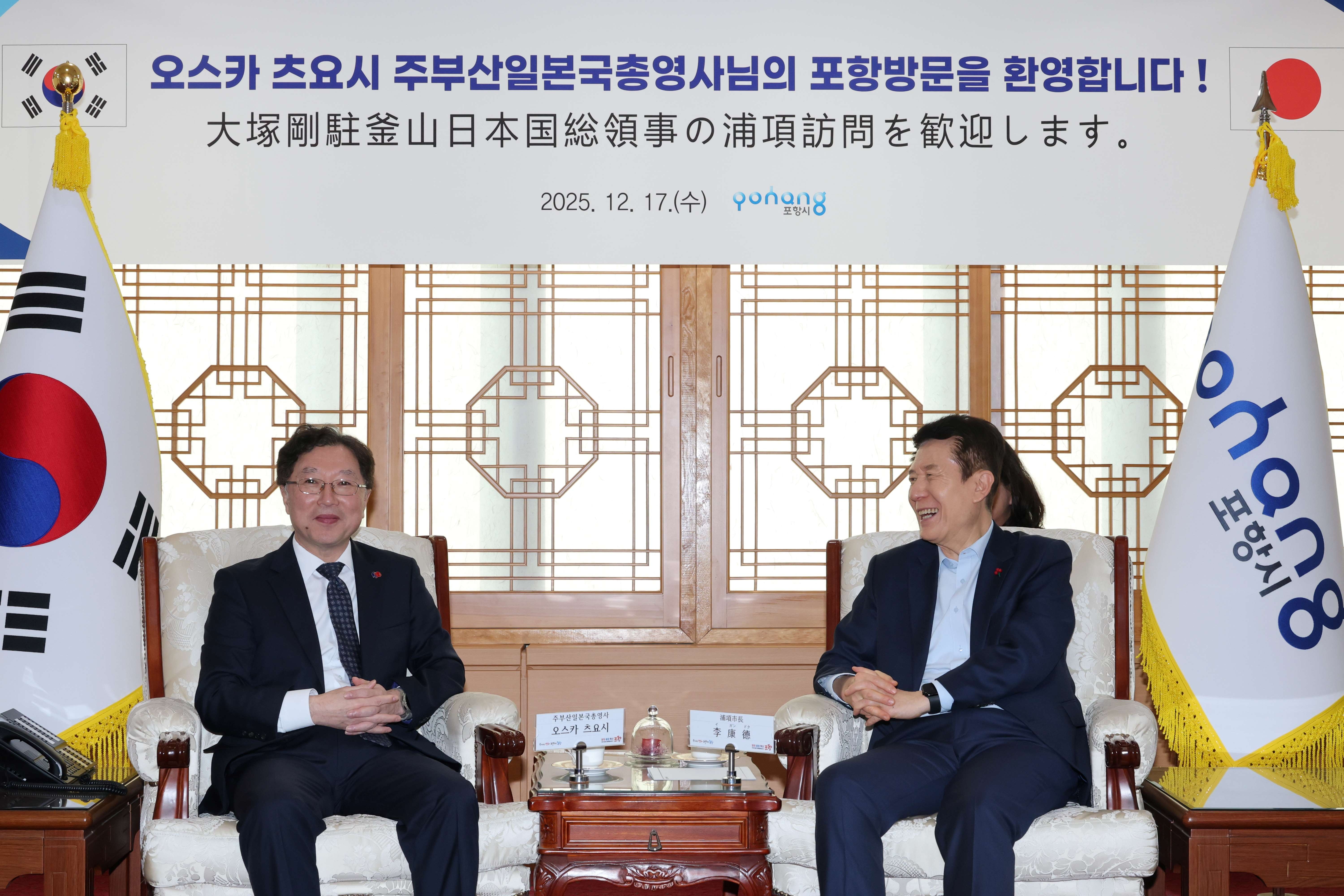 大塚総領事による李康徳(イ・ガンドク)浦項市長との面談 令和7年12月23日 【韓国語版(한국어)】 12月17日(水曜日)、大塚総領事は、浦項市庁において李康徳浦項市長と面談し、我が国と浦項市との交流促進等について意見交換を行いました。