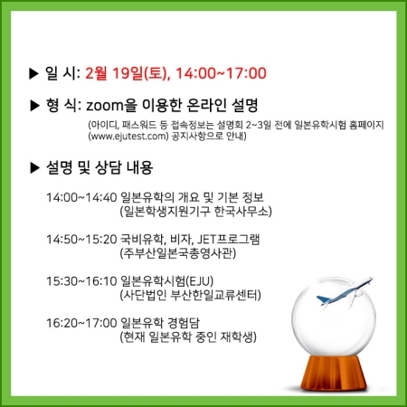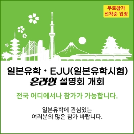일본유학・EJU(일본유학시험) 설명회 개최 2022/2/10 일본유학 및 일본유학시험(EJU)에 관한 다양한 정보를 제공하는 설명회가 온라인으로 개최됩니다. 일본유학에 관심있는 여러분의 많은 참가를 바랍니다. 자세한 내용은 아래 홈페이지를 참조하세요.
