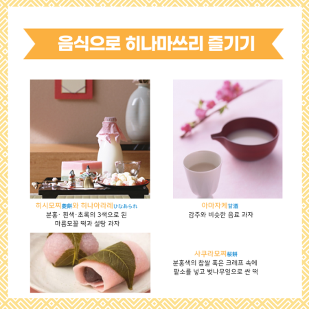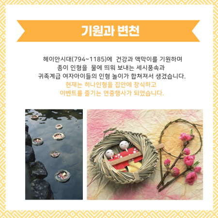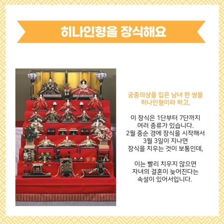 일본에는 어린이의 건강한 성장을 기원하는 행사로 여자아이를 위한 히나마쓰리(雛祭り;3월 3일)와 남자아이를 위한 단고노셋쿠(端午の節句;5월 5일)가 따로 있습니다. 봄과 함께 찾아오는 연중행사 히나마쓰리에 대해 알아봅시다.