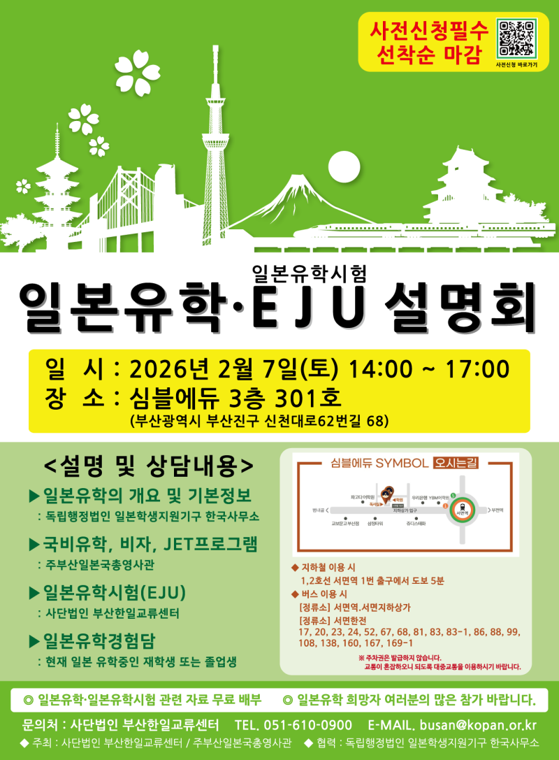 ‘일본유학·일본유학시험(EJU) 설명회’를 다음과 같이 개최합니다. 유학에 관심있는 분들의 많은 참여를 바랍니다.